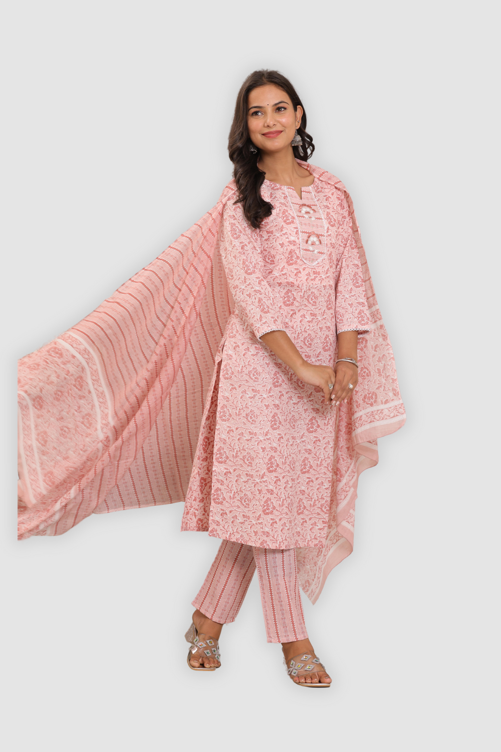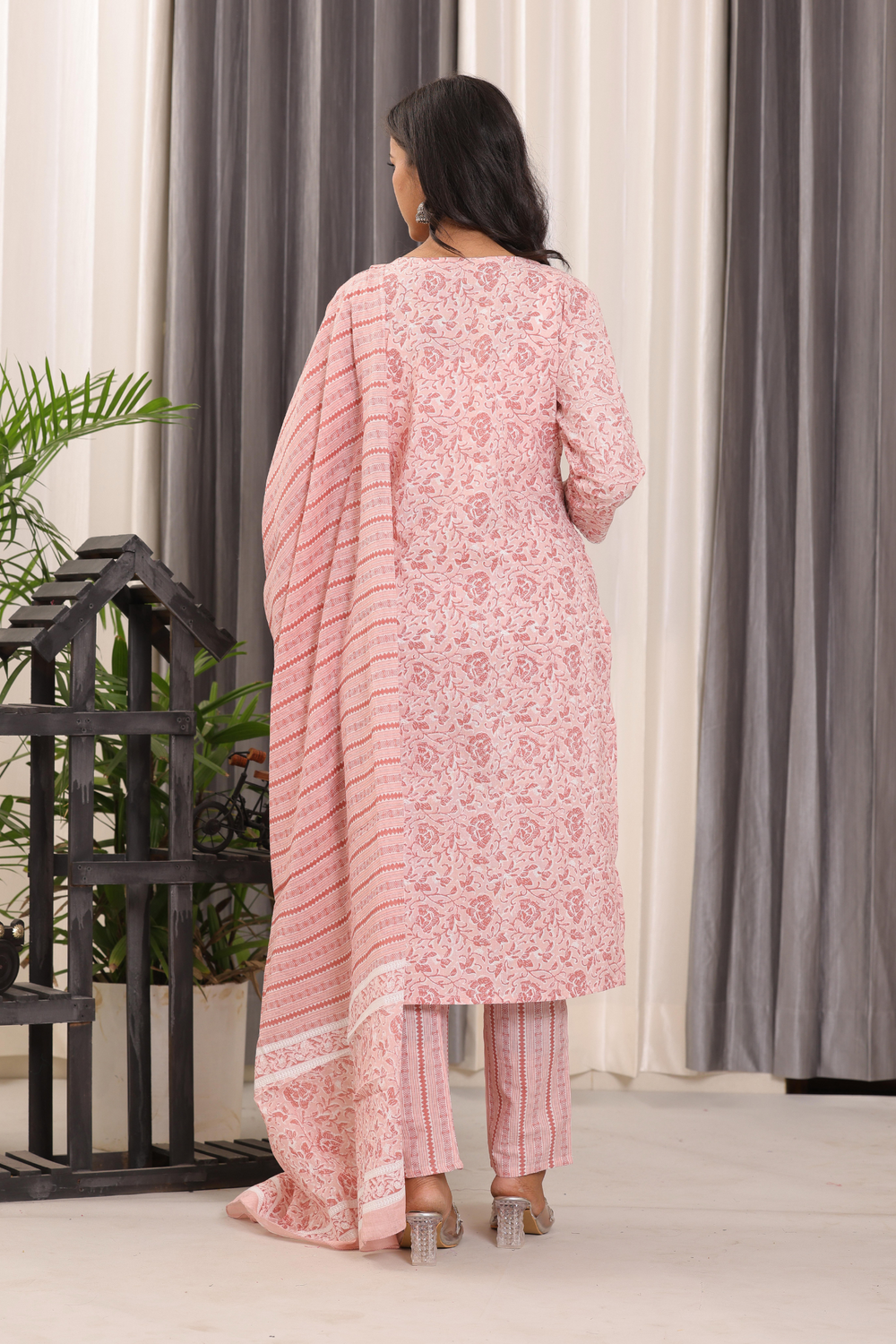 Embrace elegance with this beautiful blush pink suit set, designed to exude timeless charm. Crafted from Pure Sanwadi Cotton, this ensemble is perfect for those who seek comfort with a touch of sophistication. The intricate floral print on the kurta and pants is complemented by a striped dupatta, adding a contemporary twist to traditional wear. The delicate lace detailing on the neckline further enhances its grace, making it a must-have for festive and casual occasions alike.