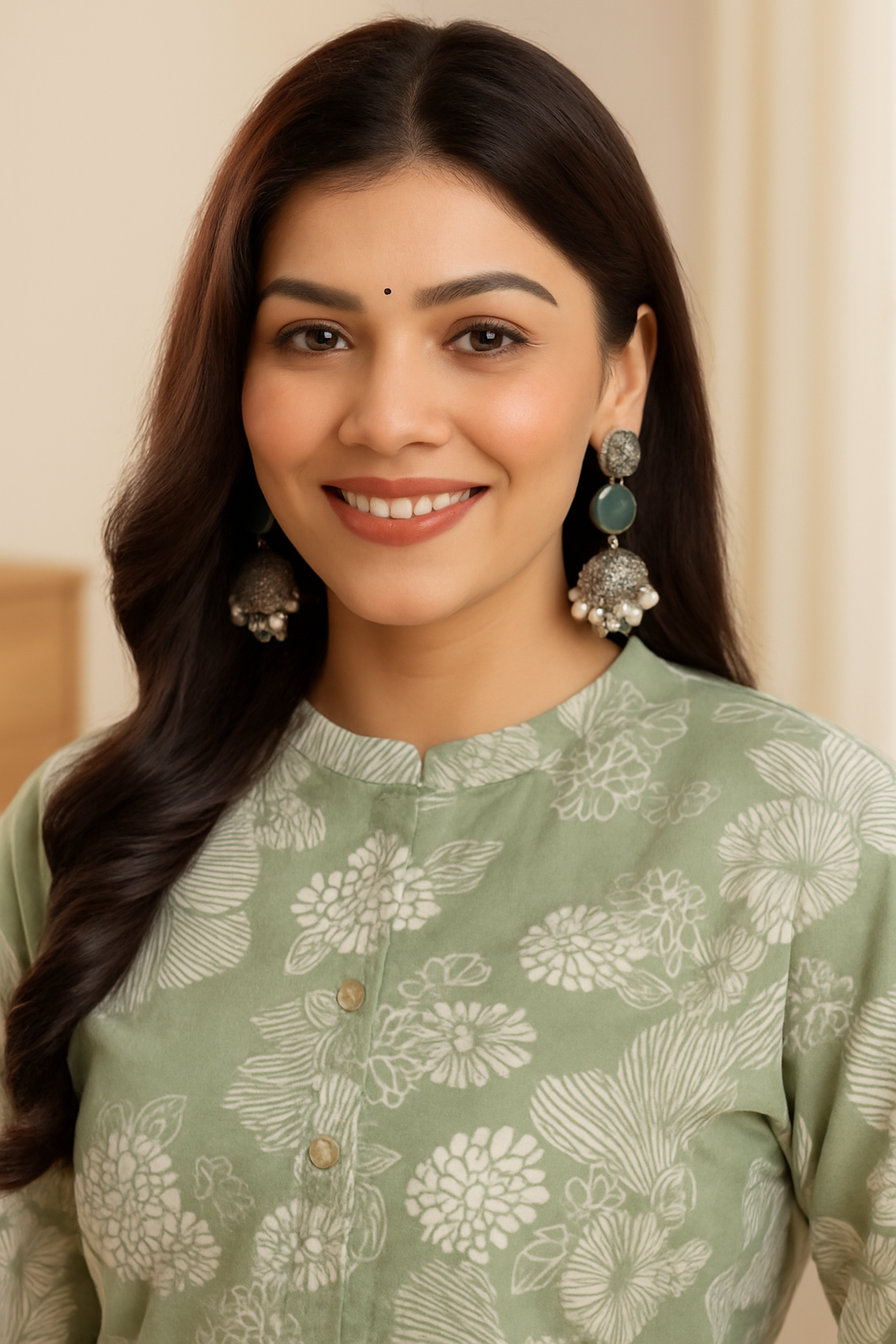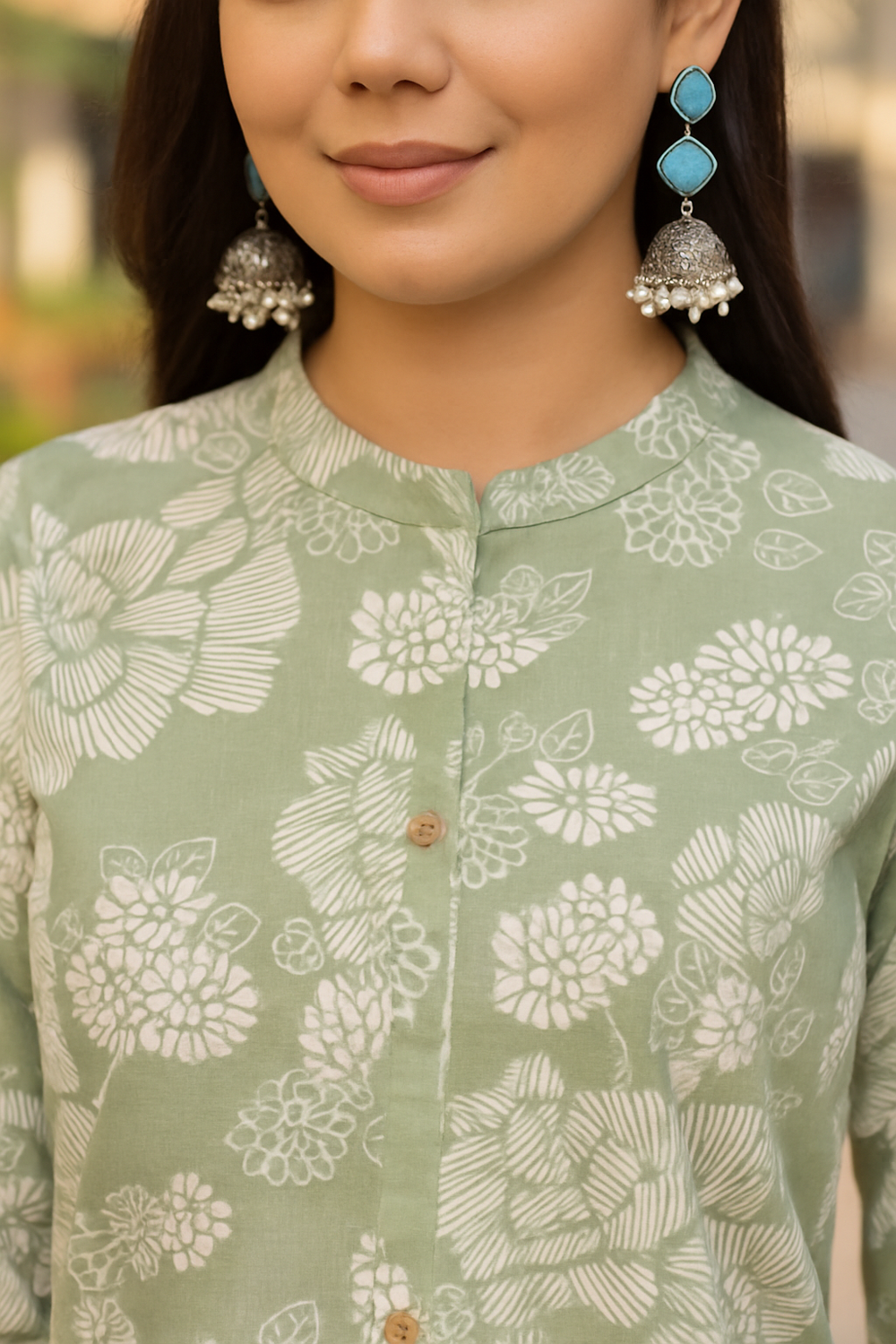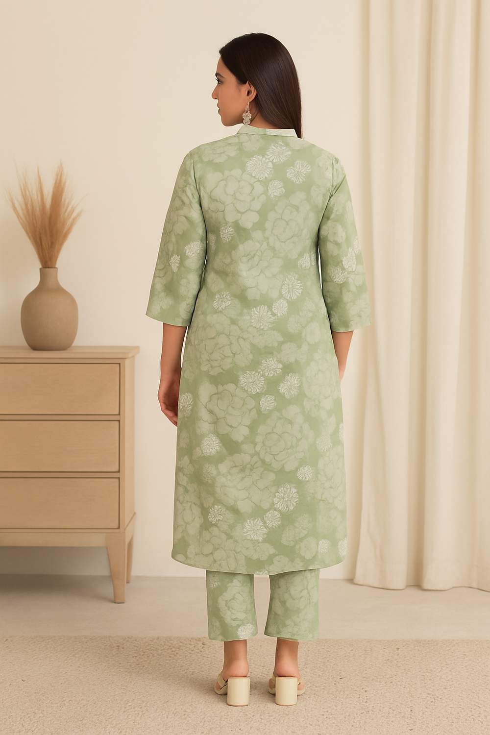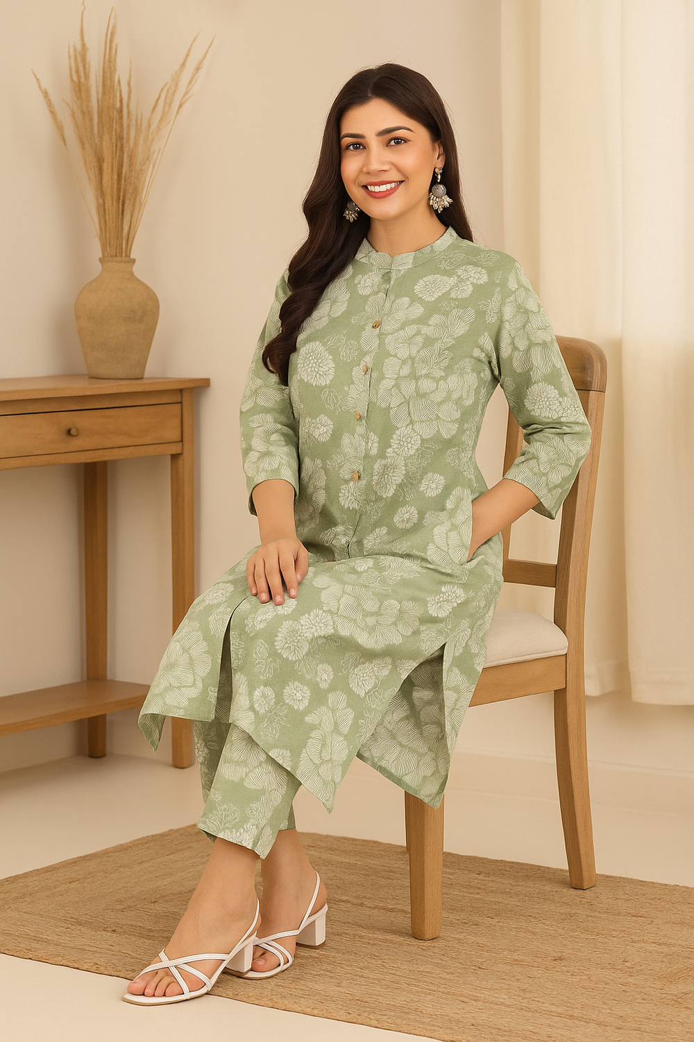 Indulge in timeless elegance with this sage green floral coord set, designed for effortless style and all-day comfort. Crafted from Pure Sanwadi Cotton, this ensemble features an A-line kurta with a mandarin collar and delicate button detailing, paired with classic straight-fit pants for a refined look. The subtle floral print adds a touch of grace, making it a perfect pick for casual outings, festive occasions, and workwear chic.