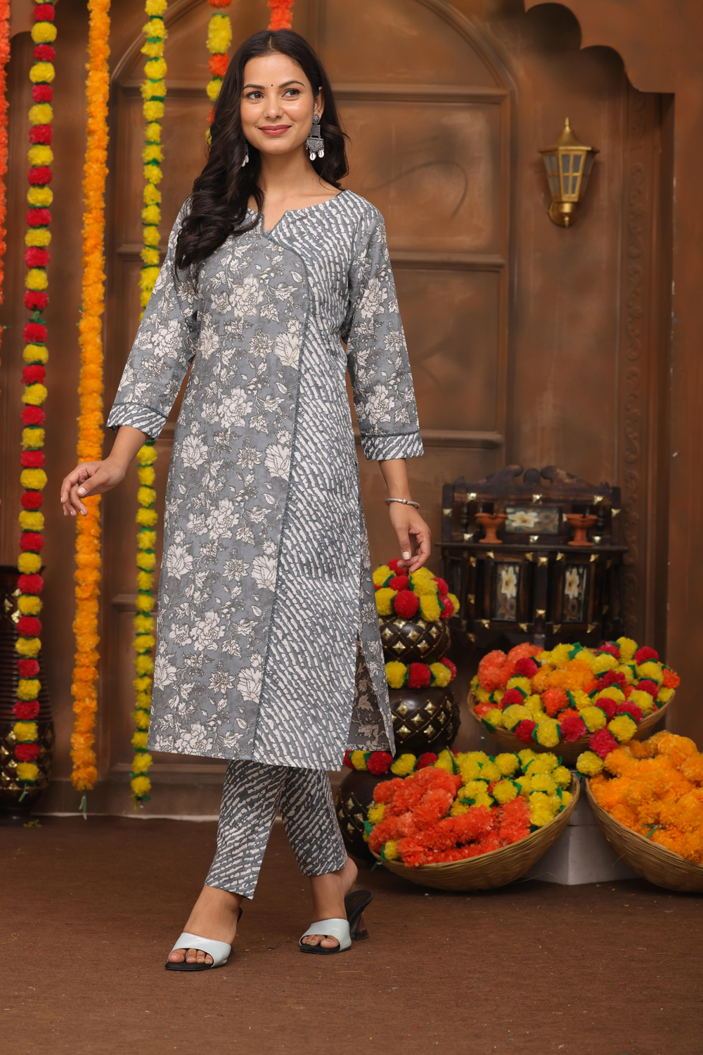 Embrace timeless elegance with this exquisite Pure Sanwadi Cotton suit set, designed to blend comfort and style effortlessly. The soothing sage green base adorned with delicate white floral prints exudes grace, while the contrasting striped detailing on the yoke, dupatta, and pants adds a contemporary charm. The flowy, soft fabric ensures all-day ease, making it perfect for any occasion.