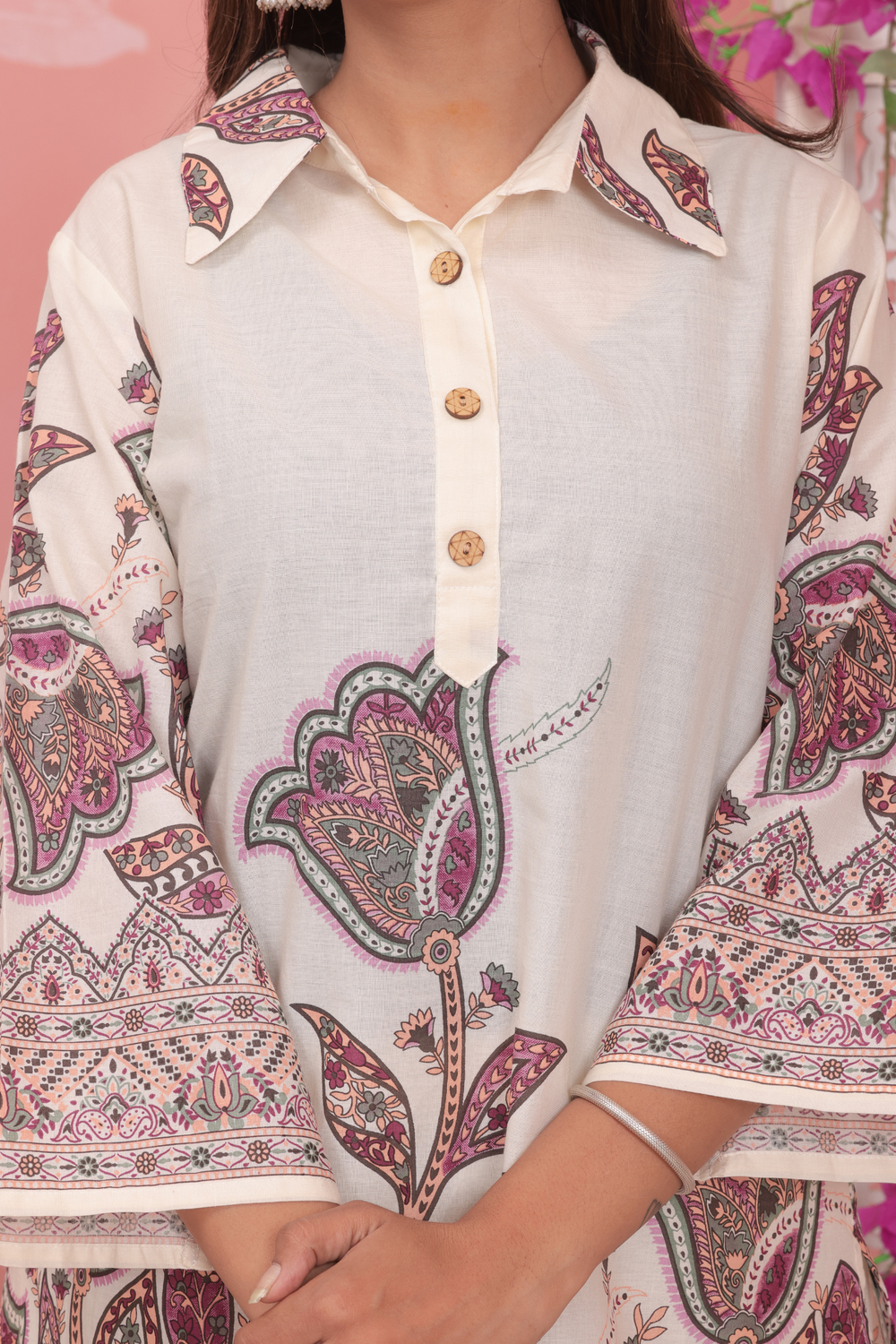 ✨ Bottom Style: Coordinated printed pants with detailed borders for a cohesive look
