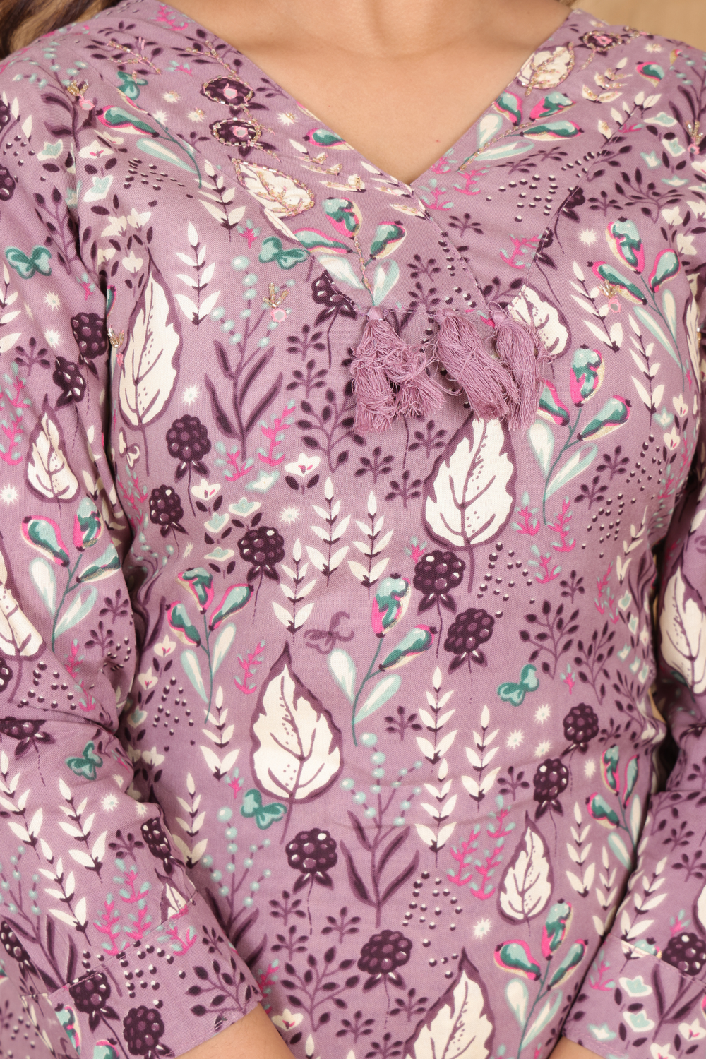 Elevate your ethnic wardrobe with this graceful and stylish cotton suit set, designed for both comfort and elegance. The soft lavender base adorned with delicate floral prints brings a touch of sophistication, while the contrasting geometric-patterned dupatta and pants add a modern charm.