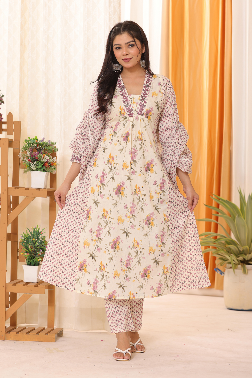 Step into effortless grace with this Pure Sanwadi Cotton suit set, designed for elegance and comfort. The soft cream base with delicate floral prints radiates sophistication, while the contrasting geometric-patterned dupatta and pants add a touch of modern charm. The flowy silhouette and intricate neckline detailing make this ensemble a must-have for every wardrobe.